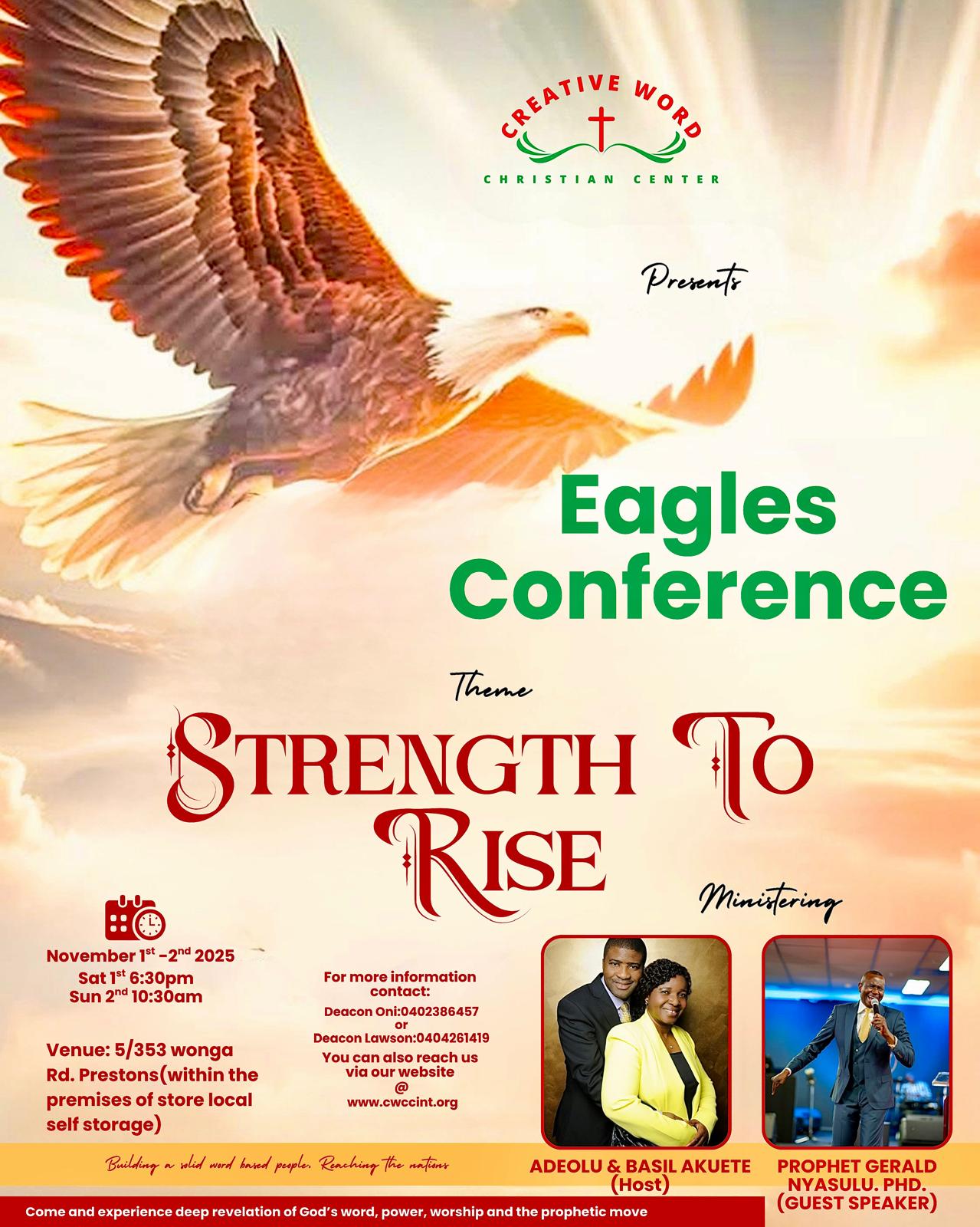 November 1 @ 6:30 pm - November 2 @ 10:30 am Eagles Conference with Prophet Gerald Nyasulu Watch out for details.......with Guest Speaker Prophet Gerald Nyasulu PHD. (Streams International Church)